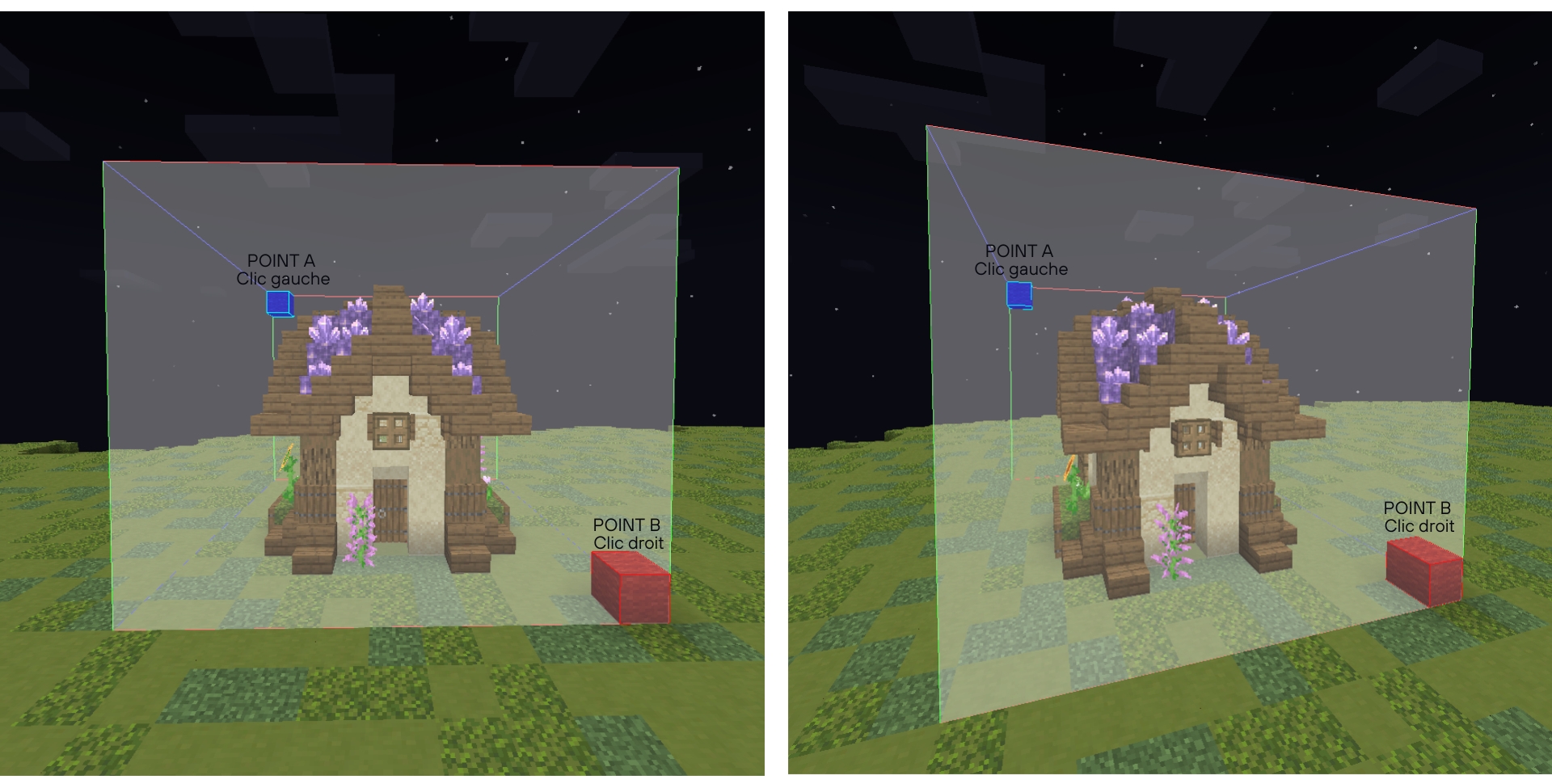 The first left click with the hoe determines the first position, while the first right click marks the second (and final) position.